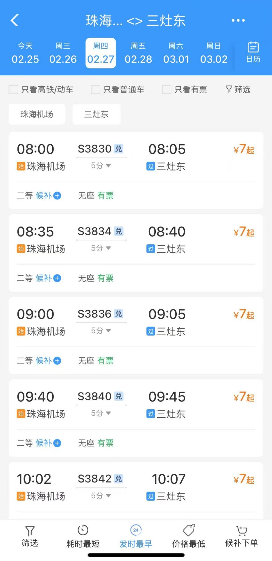 珠海机场站三灶东站需要7元起(实际价格按照铁路12306app为准)