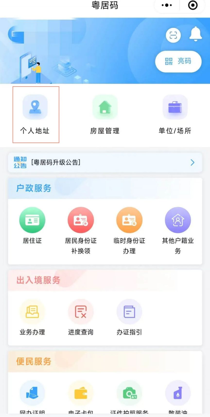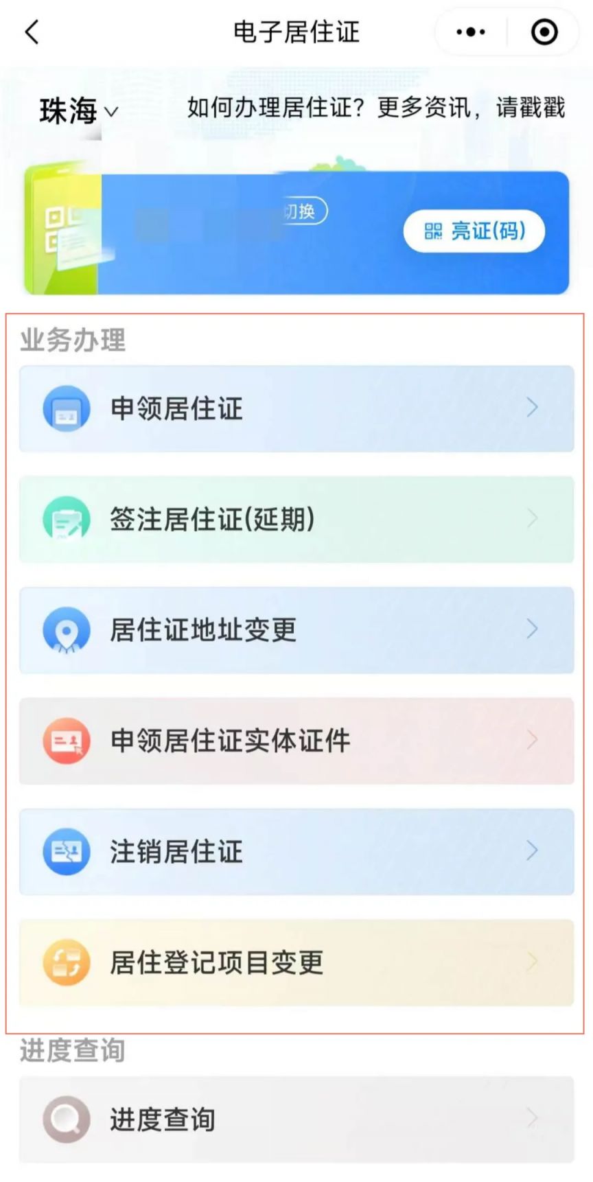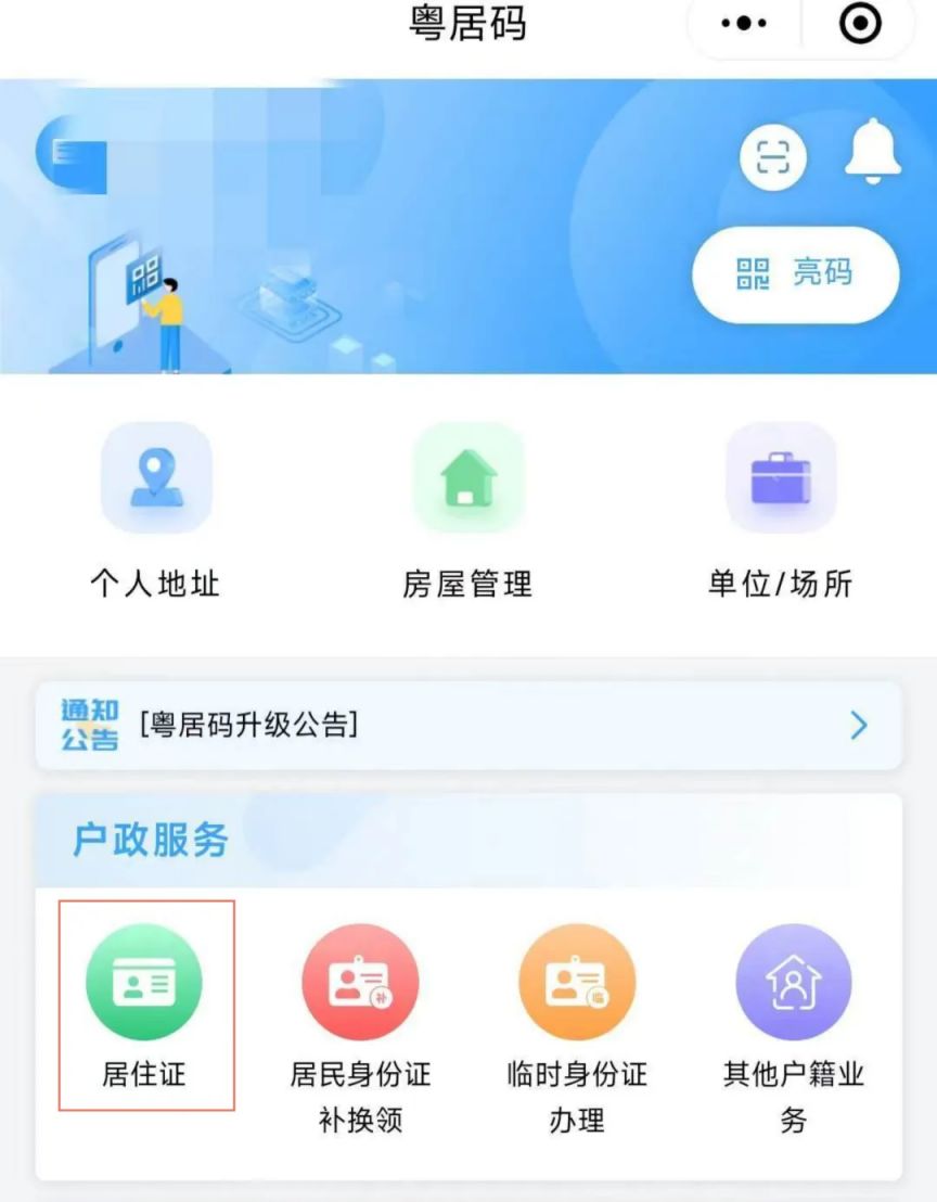 第四步:待申报居住登记核查属实后,再点击进入“粤居码”小程序,点击“居住证”即可办理申领居住证、签注居住证(延期)、居住证地址变更、申领居住证实体证件等业务。