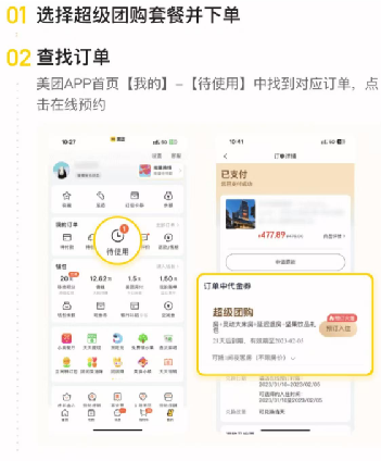 1.预约方式:进入美团或点评APP首页一点击“我的-我的订单”一选择“待使用”选择超级团购订单一点击”去使用”一选择预订日期及酒店选择产品下单(0元或需支付一定差价)一酒店订单显示“预订成功”即为兑换成功,实际使用以酒店产品展示为准。