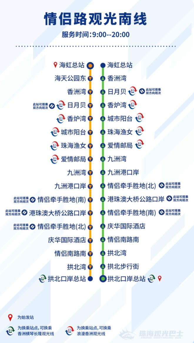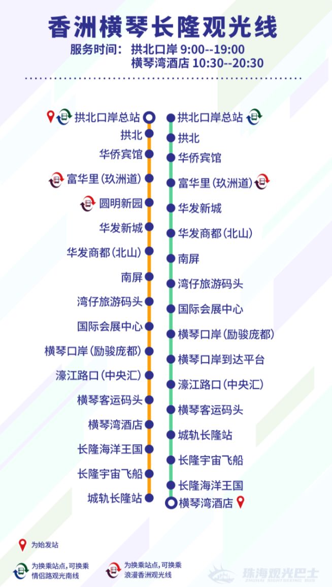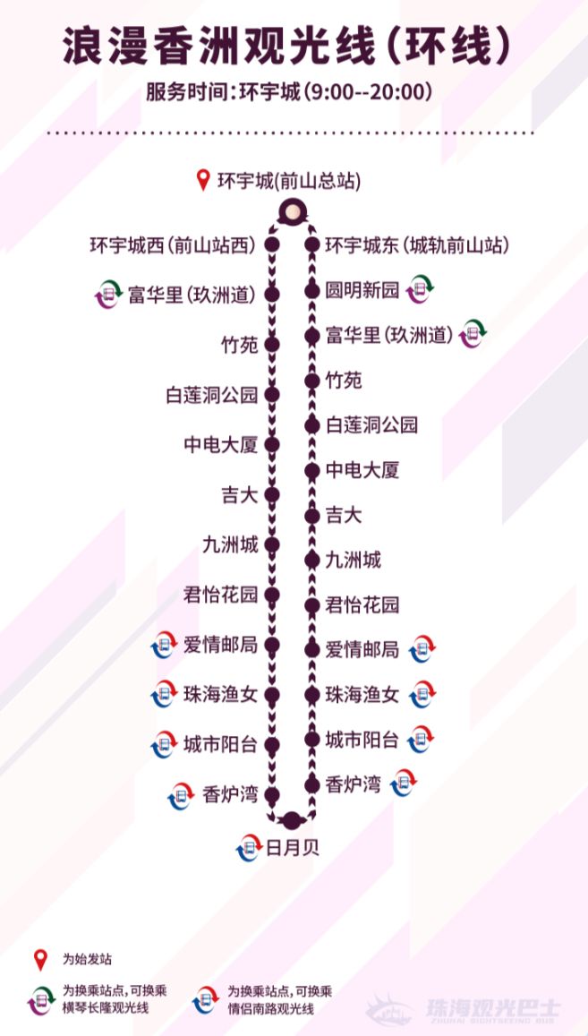 上冲旅游集散中心-城轨明珠站-梅溪旅游区-香山湖公园-体育中心西-梅华城市公园-优特汇-香洲总站-珠海博物馆-海天公园东-凤凰湾沙滩-银坑小九寨-叠石-唐家湾沙滩-唐家湾-格力滨海公园-醉美白沙滩
